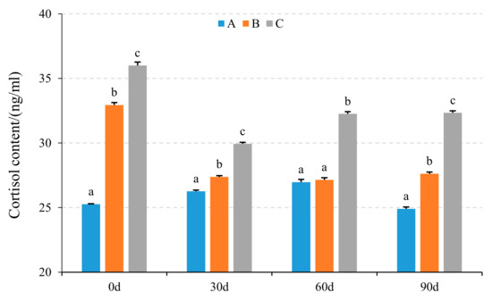 Serum cortisol content of yellowtail kingfish farmed in different densities during the whole study. Notes: A represents the low-density group, B represents the medium-density group, C represents the high-density group. Different lowercase letters indicate significant differences among the three different density groups at each sampling time (p ≤ 0.05).