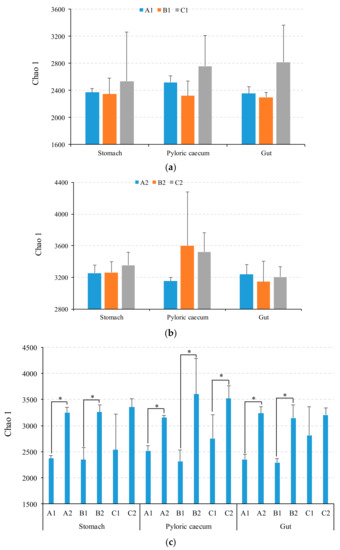 Chao1 indices of microbiota in yellowtail kingfish gastrointestinal tracts. Notes: (a) at the beginning of the study; (b) at the end of the study; (c) the analysis of the Chao1 indices of gastrointestinal microbiota between the beginning and end of the study. A1, B1, and C1 represent the low-, medium-, and high-density groups at the beginning of the study, while A2, B2, and C2 represent the low-, medium-, and high-density groups at the end of the study. * represents the significant differences in each density group between the beginning and end of the study (p ≤ 0.05).