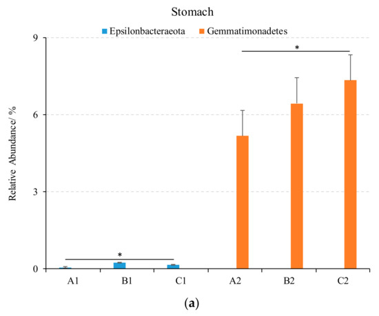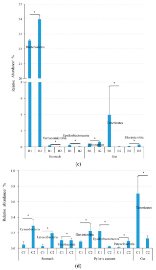 The dominant (top ten, according to the average relative abundances of the three parallel samples for each gastrointestinal tissue in each treatment) phyla with significant differences in the gastrointestinal tracts of yellowtail kingfish. Notes: (a) among the three different density groups at the beginning and end of the study; (b) between the beginning and end of the study for the low-density group; (c) between the beginning and end of the study for the medium-density group; (d) between the beginning and end of the study for the high-density group. A1, B1, and C1 represent the low-, medium-, and high-density groups at the beginning of the study, while A2, B2, and C2 represent the low-, medium-, and high-density group at the end of the study. * represents significant differences for the same phylum between the beginning and end of the study in each density group (p ≤ 0.05).