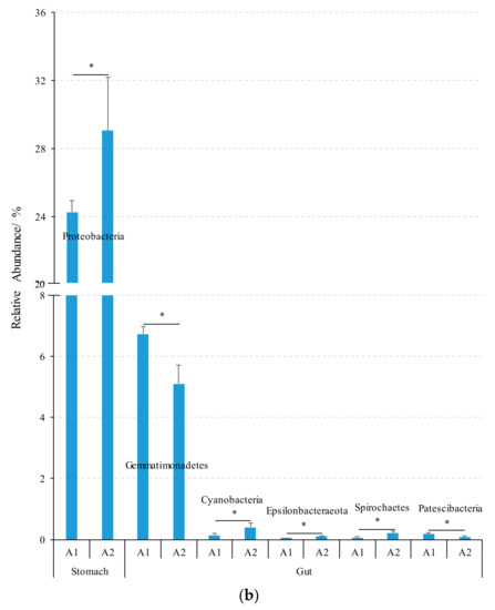 The dominant (top ten, according to the average relative abundances of the three parallel samples for each gastrointestinal tissue in each treatment) phyla of relative abundance in each sample are presented in Figure S2. Firmicutes, Proteobacteria, Bacteroidetes, Actinobacteria, Gemmatimonadetes, Acidobacteria, and Nitrospirae were the shared and dominant phyla in the gastrointestinal tract in this study. The relative abundances of the first three dominant phyla, including Firmicutes, Proteobacteria, and Bacteroidetes, were 22.31–33.22%, and the sum of these phyla was 74.23–80.97%. In the stomach, there were significant differences in the relative abundances of Epsilonbacteraeota at the beginning of this study and Gemmatimonadetes at the end of the study among the three density groups (p ≤ 0.05) (Figure 3a). In the low-density group, there were significant differences in the relative abundances of Proteobacteria in the stomach, and Gemmatimonadetes, Cyanobacteria, Epsilonbacteraeota, Spirochaetes, and Patescibacteria in the gut between the beginning and end of the study (p ≤ 0.05) (Figure 3b). In the medium-density group, there were significant differences in the relative abundances of Bacteroidetes, Verrucomicrobia, and Epsilonbacteraeota in the stomach, and Nitrospirae, Tenericutes, and Elusimicrobia in the gut between the beginning and end of the study (p ≤ 0.05) (Figure 3c). In the high-density group, there were significant differences in the relative abundances of Cyanobacteria, Latescibacteria, and Fusobacteria in the stomach, Elusimicrobia, Epsilonbacteraeota, and Patescibacteria in the pyloric caecum, and Tenericutes in the gut between the beginning and end of the study (p ≤ 0.05) (Figure 3d). More importantly, the ratio of Firmicutes to Bacteroidetes in the medium-density group was higher in each gastrointestinal tissue (Figure 4).