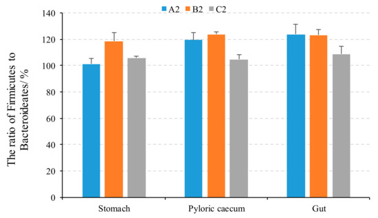 The ratio of Firmicutes to Bacteroidetes in the gastrointestinal tract of yellowtail kingfish. Notes: A2, B2, and C2 represent the low-, medium-, and high-density groups at the end of the study.