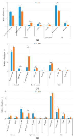 The dominant genera with significant differences in the gastrointestinal tract of yellowtail kingfish. Notes: (a) between the beginning and end of the study for the low-density group; (b) between the beginning and end of the study for the medium-density group; (c) between the beginning and end of the study for the high-density group. A1, B1, and C1 represent the low-, medium-, and high-density groups at the beginning of the study, while A2, B2, and C2 represent the low-, medium-, and high-density group at the end of the study. * represents the significant differences between the beginning and end of the study in each density group (p ≤ 0.05).