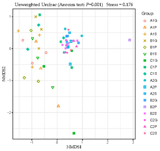 The nonmetric multidimensional scaling (NMDS) analysis. Notes: A1S, B1S, and C1S represent the stomach samples in the low-, medium-, and high-density groups at the beginning of the study, while A1P, B1P, and C1P represent the pyloric caecum samples in the low-, medium-, and high-density groups at the beginning of the study, and A1G, B1G, and C1G represent the gut samples in the low-, medium-, and high-density groups at the beginning of the study, respectively. Likewise, A2S, B2S, C2S, A2P, B2P, C2P, A2G, B2G, and C2G represent the stomach, pyloric caecum, and gut samples in the low-, medium-, and high-density groups at the end of the study, respectively.