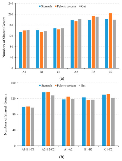 The shared genera of each tissue of yellowtail kingfish. Notes: (a) among the three parallel groups of each density group; (b) among three different density groups at the beginning or end of the study, and between the beginning and end of the study for each density group. A1, B1, and C1 represent the low-, medium-, and high-density groups at the beginning of the study, while A2, B2, and C2 represent the low-, medium-, and high-density groups at the end of the study.
