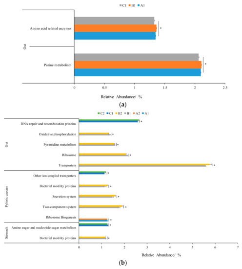 The dominant (top fifteen, according to the relative abundances) KEGG pathways with significant differences in the gastrointestinal microbiota. Notes: (a) among the three different density groups at the beginning or end of the study; (b) between the beginning and end of the study for each density group. A1, B1, and C1 represent the low-, medium-, and high-density groups at the beginning of the study, while A2, B2, and C2 represent the low-, medium-, and high-density groups at the end of the study. * represents the significant differences between the beginning and end of the study in each density group (p ≤ 0.05).