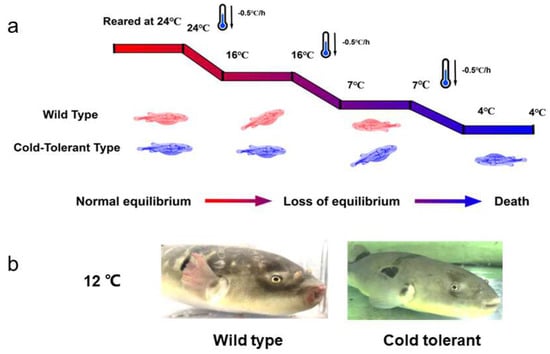 To investigate their resistance to cold stress, fugu were pre-acclimated to the optimal temperature for 7 days. Subsequently, the temperature was gradually lowered from 24 °C, and the behavior of the 2 types of fugu under low-temperature response was recorded. For wild-type fugu, the behavioral responses changed with decreasing temperatures. The fish showed normal swimming behavior at 18 °C for 12 h, began to swim uncoordinatedly (e.g., head down and bumping into tank walls and subcutaneous congestion) at 16–12 °C, had difficulty maintaining equilibrium at 9 °C, and completely lost equilibrium and fell into a coma at 7 °C. As for cold-tolerant fugu, abnormal behavior barely appeared until the water temperature dropped to 7 °C for 12 h and eventually collapsed at 4 °C (Figure 1). Apparently, the lethal temperature of 50% (LT50) for wild-type fugu was 13.2 °C, at which only a few cold-tolerant individuals lost equilibrium. Compared to wild-type, LT50 in cold-tolerant fugu was as low as 6.2 °C. Surprisingly, the lowest survival temperature was nearly 3.9 °C (Figure S1).