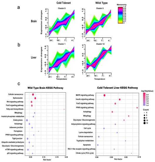 Global overview of differentially expressed genes at cold temperature in wild-type and cold-tolerant fugu. (a,b) Cluster analysis of differentially expressed genes in cold-tolerant fugu. KEGG pathway enrichments for the genes differentially expressed under cold stress. (c) Bubble plots indicate the enriched KEGG pathways for the wild-type of brain up-regulated (right-top panel) and cold-tolerant of liver up-regulated (right-bottom panel) genes. The Mfuss enriched up-regulated genes at different temperatures under cold stress in wild-type brain and cold-tolerant liver tissues were used for analysis.