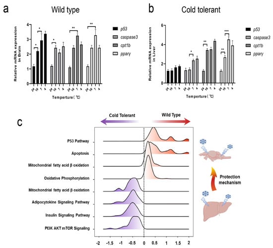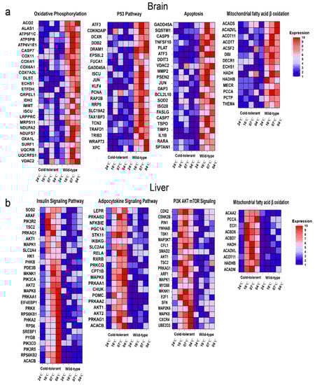 In wild-type fugu, we revealed higher expression of pathways such as mitochondrial fatty acid β oxidation, oxidative phosphorylation, and p53 pathway in brain tissues under lower temperature, which could induce apoptosis in the central nervous system (CNS) and brain damage, leading to coma or death of wild-type fugu (Figure 4). Surprisingly, when it comes to cold-tolerant fugu, we did not detect visible changes in the expression of pathways paralleled to that in wild-type brains under cold conditions. Meanwhile, the expression of pathways such as insulin signaling pathway, adipocytokines, mitochondrial fatty acid β oxidation, and AKT mTOR pathway significantly increased in the liver, which indicated the generation of liver glycogenolysis and fatty acids catabolism in cold-tolerant fugu when facing the cold.