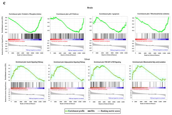 Comparing brain and liver activation-related gene expressions between wild-type and cold-tolerant fugu under cold stress. (a,b) Analyses of gene expression of the GSEA for brain (top) and liver (bottom) under cold stress. (c) Genesets enriched the FDR < 0.05 pathways: oxidative phosphorylation (NES = −2.27), p53 (NES = −1.51), apoptosis (NES = −1.08), mitochondrial fatty acid β oxidation (NES = −1.81) in brain. Insulin signaling (NES = 1.52), adipocytokine (NES = 1.45), PI3K AKT mTOR (NES = 1.36), mitochondrial fatty acid β oxidation (NES = 1.45) in liver; NES, normalized enrichment score. FDR, false discovery rate. Positive and negative NES indicate higher and lower expression in the brain and liver, respectively.