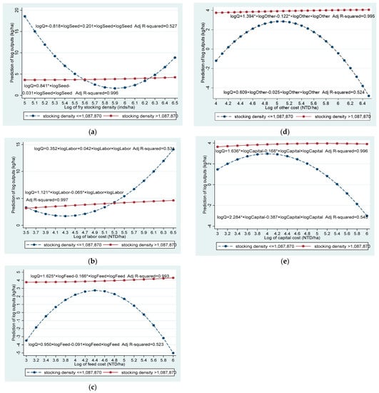 | Stocking Density ≤ 1,087,870 (inds/ha) [Standard Deviation] | Stocking Density > 1,087,870 (inds/ha) [Standard Deviation] | Feed Cost ≤13,889 (NTD/ha) [Standard Deviation] | Feed Cost > 13,889 (NTD/ha) [Standard Deviation] | |