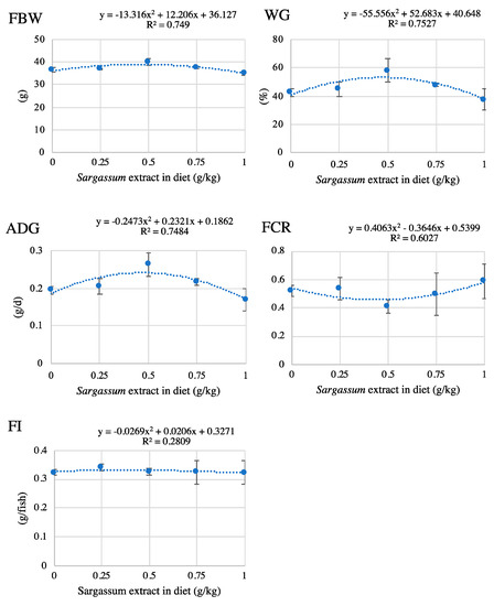 All data were analyzed by parametric methods based on their normality and homoscedasticity. The hot-water extract from Sargassum had a significant effect on several growth performance parameters, FBW, WG, and ADG (Table 3; ANOVA, p < 0.05). The FBW, WG, and ADG were quadratically (p = 0.001, 0.036, and 0.012, respectively) but not linearly (p = 0.620, 0.585, and 0.539, respectively) affected by the addition of the hot-water extract. The highest FBW (40.10 g), WG (57.97%), and ADG (0.26 g·d−1) were recorded in the fish that received the hot-water extract at 0.5 g·kg−1 of diet. The hot-water extract at 1 g·kg−1 of diet appeared to be the least appropriate since the fish in this group recorded the lowest value for FBW (34.95 g), WG (37.54%), and ADG (0.17 g·day−1), although some values did not show significant differences with those of fish that were fed control diet: FBW (36.59 g), WG (42.51%), and ADG (0.19 g·day−1).