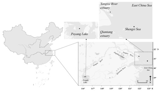 - Yang, J.; Arai, H.; Liu, B.; Miyazaki, N.; Tsukamoto, K. Reconstructing habitat use of Coilia mystus and Coilia ectenes of the Yangtze River estuary, and of Coilia ectenes of Taihu Lake, based on otolith strontium and calcium. J. Fish. Biol. 2006, 69, 1120–1135. [Google Scholar] [CrossRef]