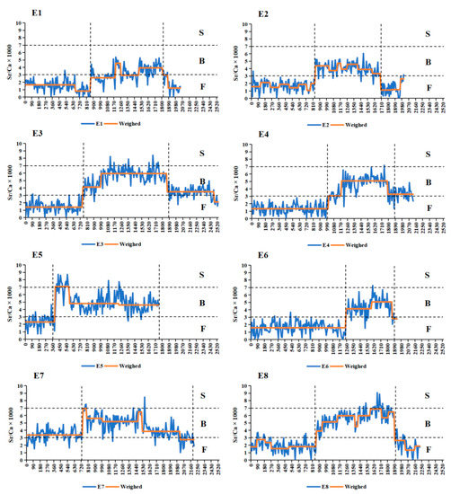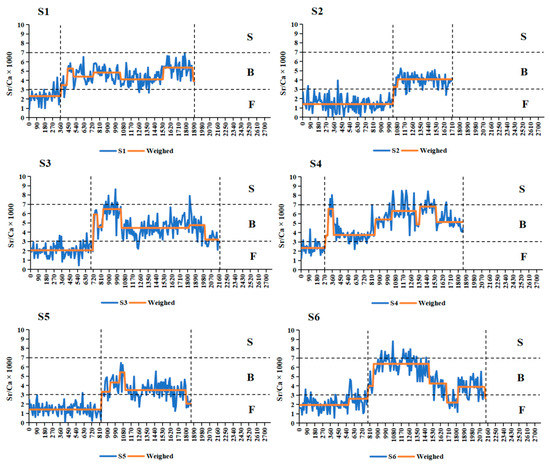 Fluctuation in otolith Sr/Ca ratios along line transects from the core (0 μm) to the edge in the sagittal plane of the otoliths of different Coilia nasus groups along Shengsi Sea area. Orange solid line represents the Sr/Ca ratios after trend conversion; blue solid lines represent actual Sr/Ca ratios. S: seawater, B: brackish water, F: fresh water.