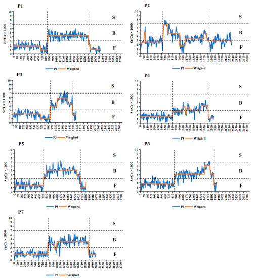 3.2. The Quantitative Line Analysis of Sr and Ca Contents (Sr/Ca Ratios)