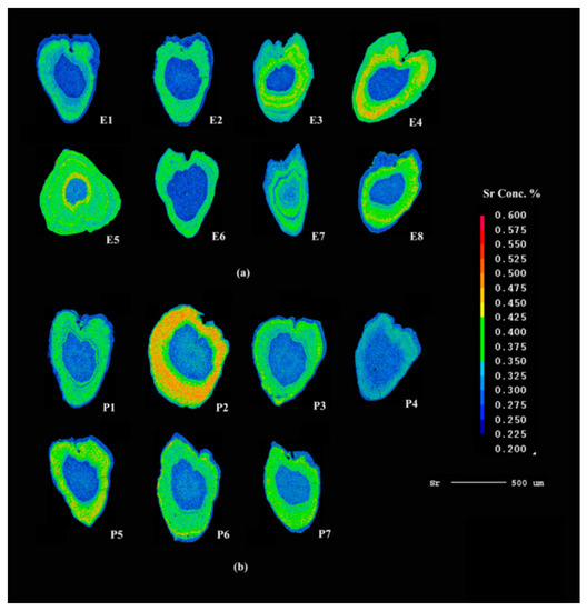 Two-dimensional imaging using X-ray electron microprobe analysis of the Sr concentrations in the sagittal plane of the otoliths of individual Coilia nasus from Yangtze River estuary (a) and Poyang Lake (b), China. The values corresponding to Sr concentrations are represented by 16 colors from red (highest) through yellow and green, to blue (lowest).