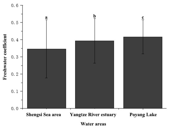 Freshwater coefficient of Coilia nasus in each water area (different letters indicate significant differences, p < 0.05).