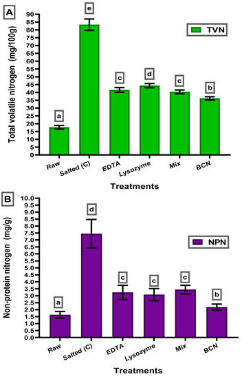 The Protein content changes evaluation results of the salted mullet are enhanced by coating before the salting process. The data are represented as means ± SD values; different letters on a column mean significant differences for each graph. (A) represents the total volatile nitrogen value changes according to the treatments. (B) represents the non-protein nitrogen value changes according to the treatments. Lysozyme was applied at 100 ppm concentration; the EDTA was used at 1 nM concentration. Mix solution was prepared from lysozyme (100 ppm) and EDTA solution (1 nM).