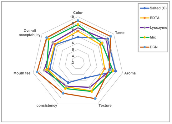 The salting process reduced the moisture content, pH, and crude protein of grey mullet fish [36,37]. These studies observed that the NPN increased by up to 8 mg/gm after the salting period, whereas the TVN increased by up to 90 mg/100 g of flesh. The influence of prepared mullet salted fish with lysozyme, EDTA, and a combination of lysozyme and EDTA on moisture, pH salt, total lipid, and crude protein levels of salted fish is restricted compared to commercial salted mullet. Adding lysozyme and EDTA to salted fish influenced lipid hydrolysis and protein degradation, but the FFA was somewhat lower in treated salted fish than in commercial samples. The NPN in treated salted fish was lower than in commercial samples. The TVN was reduced from 58.3 mg/100 g in untreated samples to 42.7 mg/100 g when 100 mg/L lysozymes and 1 mM EDTA were used. The TVN level rises according to the autolytic amino acid deamination and microbiological contamination occurrence [38]. This theory is explained by protein denaturation, which could occur at greater brine concentrations just when salt penetrates the flesh [2]. Protein denaturation always happens in salted fish; however, it usually occurs more slowly than salt penetration [39]. The salt ions serve as counterions to negatively and positively charged groups, disrupting the proteins’ natural structure. The sarcolemma in intact muscle prevents salt from penetrating the flesh and causing swelling of the myofibrillar matrix [5]. Salt denaturation and pH changes reduce the extractability of fish muscle proteins [39]. In the present investigation, the lower changes in the TVN levels could be joined to the impact of coated dipping layer formed by the treatments. These layers (EDTA, lysozyme, mixture, and BCN) serve a double agent impact, decrease the salt penetration rate, and preserve against microbial contamination.