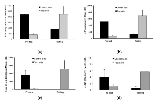To analyze eDNA data, we used Mann–Whitney–Wilcoxon tests to compare eDNA concentrations between control and test sides for both pre-test and testing periods, as these data were not normally distributed. Mann–Whitney–Wilcoxon test could only be conducted for eDNA concentrations during experiment 2 as only mean eDNA copy numbers for each side and periods were available for experiment 1. Fold change was also calculated for eDNA on the test side of the pond as eDNA concentration at the test side during testing minus eDNA concentration at the test side during the pre-test period divided by eDNA concentration at the test side during the pre-test period.