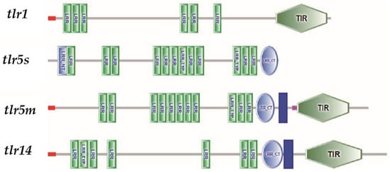 Domain analysis showed that the four TLRs all contained extracellular LRR motifs (Figure 1); however, the numbers varied, ranging from six LRR motifs in tlr1 to twelve in tlr5s. The LRR motif is an important part of the TLR receptor ligand binding site, and the number of LRR motifs might be related to the recognition mechanism of foreign pathogens. Except for tlr5s, which lacked a signal peptide, transmembrane region, and TIR domain, the other TLRs have typical TLR functional domains [19]. There are three conserved functional areas, Box 1, Box 2, and Box 3 in the TIR domain. These conserved functional areas play an important role in the activation of downstream signaling pathways through signal protein transduction [20].