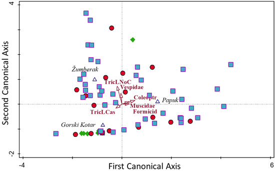 CVA analysis indicated differences in prey intake within regions. The best predictors in the Žumberak region were Trichoptera and Vespidae (p < 0.05), as opposed to Coleoptera, Formicidae and Muscidae (Diptera) in the Papuk region (p < 0.05) and Trichoptera in Gorski Kotar (p < 0.05). Discrimination of consumed prey items between lineages and within regions was not indicated, except the grouping of AT specimens in Gorski Kotar (Figure 2; Appendix D).