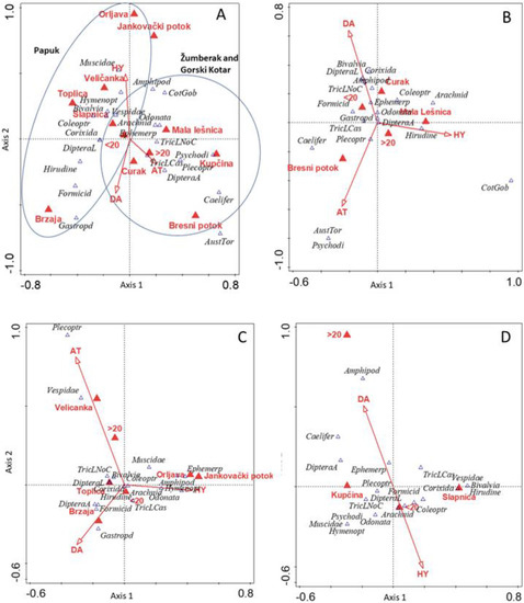 Canonical correspondence analysis ordination diagram representing the IRI of the main prey items of brown trout at each sampling site. (A) Total variation is 6.79, and explanatory variables account for 25.0% of the variation; Monte Carlo permutation test results on all axes: pseudo-F = 2.0, p = 0.002. (B) Gorski Kotar: total variation is 6.06, and explanatory variables account for 32.3% of the variation; Monte Carlo permutation test results on all axes: pseudo-F = 1.4, p = 0.024. (C) Papuk: total variation is 4.50, and explanatory variables account for 36.1% of the variation; Monte Carlo permutation test results on all axes: pseudo-F = 1.9, p = 0.002. (D) Žumberak: total variation is 5.09, and explanatory variables account for 25.0% of the variation; Monte Carlo permutation test results on all axes: pseudo-F = 1.2, p = 0.198; (→—dummy explanatory variables
