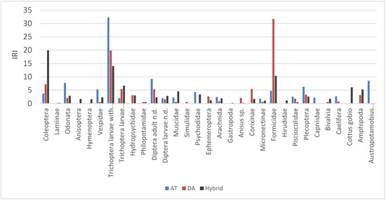 According to the IRI coefficient, the main prey items of brown trout of both lineages were aquatic Coleoptera, Trichoptera, Diptera and terrestrial Formicidae (Figure 4; Appendix C). Terrestrial Formicidae, Gastropoda and Corixidae appear to be important for the DA lineage, whereas Coleoptera, Amphipoda and bullhead are important for the HY group. Cased Trichoptera larvae, adult Diptera, Psychodidae and larger prey, such as the native stone crayfish, were more important prey for the AT than the DA lineage and HY group (Figure 4). According to the Schoener index (α), statistically significant diet overlap was detected between DA and AT specimens (α = 0.66, p < 0.05) (Table 3) within the Gorski Kotar region, where the most of AT lineage were detected.