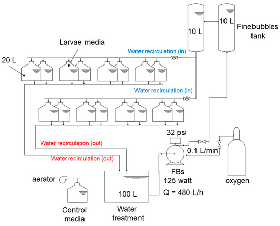 The total flowrate (Q) in the recirculating system was 480 L/h, and consequently, each larva media received an equal amount of water supply for each 16-larva media (30 L/h).