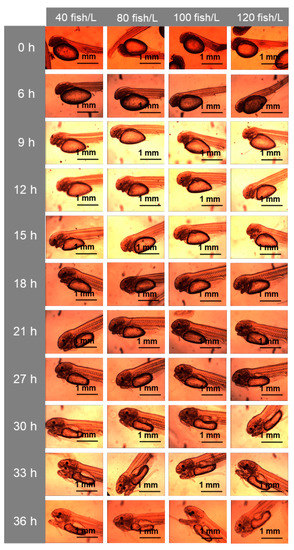 The visual observation shows no substantial change in the percentage volume of yolk sac in the initial 0–9 hah at all stock densities, but changes appear at 12–21 hah. However, the percentage volume of yolk sac was not clearly observed at different stock densities. Therefore, additional analysis from Figure 2 would be beneficial in perceiving the percentage volume of yolk sac at various stock densities. It was observed that at stock density D120, a slow decrease in the percentage volume of yolk sac was observed compared to the stock density D40–D100. This might be due to several factors including higher oxygen demand for the metabolism process at higher stock density required for yolk sac absorption. Thus, it was suggested that more efficient metabolism occurs at lower stock density, as highlighted in Figure 3.