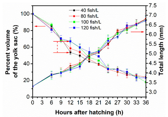 where Wt0 = weight of larvae at initial period (0 hah) in endogenous stage, K = condition factor (5.16 × 10−6), n = 3.11, and Lt0 = length of larvae at initial period (0 h) in endogenous stage for each density. Furthermore, the total length at the end of endogenous stage was calculated using the length growth rate for larvae in each stock density using Equation (12).