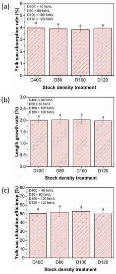 (a) Yolk sac absorption rate, (b) length growth rate, and (c) yolk sac utilization efficiency of striped catfish (Pangasianodon hypophthalmus) larvae at various stock density treatment levels in endogenous stage, at a mean temperature of 26.08 °C. Vertical bars indicate standard error, the same letters “a” denote no different (p > 0.05).