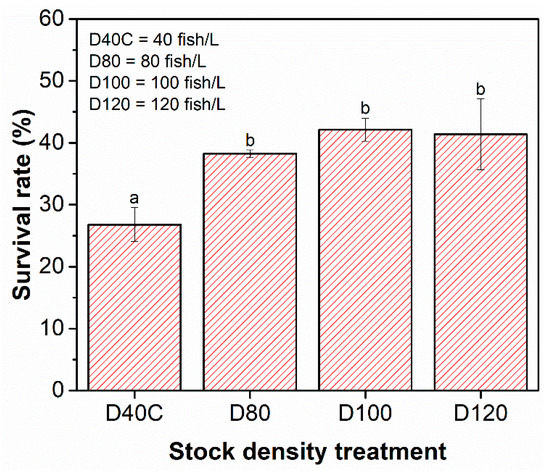 The survival rate of striped catfish (Pangasianodon hypophthalmus) larvae at various stock density treatment levels in exogenous stage, at mean temperature of 27 °C. Vertical bars indicate standard error. Different letters denote significant differences between groups (p < 0.05).