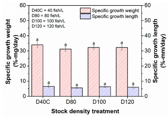 The specific growth rate of weight and length of striped catfish (Pangasianodon hypophthalmus) larvae at various stock density treatment levels in exogenous stage, at mean temperature of 27 °C. Vertical bars indicate standard error. Different letters denote significant differences between groups (p < 0.05).