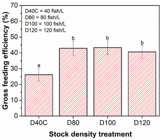 Gross feeding efficiency (GFE) of striped catfish (Pangasianodon hypophthalmus) larvae at various stock density treatment levels in exogenous stage, at mean temperature of 27 °C. Vertical bars indicate standard error. Different letters denote significant differences between groups (p < 0.05).