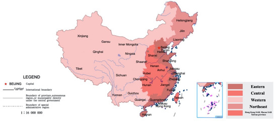 Regional divisions of Eastern, Central, Western, and Northeastern China (The map of China was generated by the standard map online service; URL link: http://bzdt.ch.mnr.gov.cn (accessed on 7 May 2022)).
