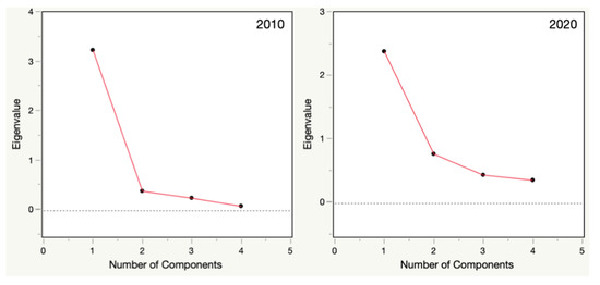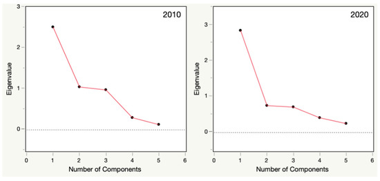 The first step in principal component analysis is to observe the scree plot that the procedure generates, to analyse the income of Chinese fisherfolk in 2010 and 2020. The importance of the principal components can be seen (Figure 2), whereby the eigenvalues of the first three principal components in 2010 and 2020 are relatively elevated and steep, implying greater variability in the first three components. Hence, this may reflect how the first three principal components chosen for this study represent the original variables for the income of Chinese fisherfolk. When more principal components are included in the study, which explains most of the variance in the original data, then the PCA model performs more effectively. However, only the principal components that explain most variance (70–95%) should be retained [33]. Therefore, it is crucial to examine the variations in the eigenvalues of Chinese fisherfolk incomes in 2010 and 2020 (Table S1). Regarding the eigenvalues of Chinese fisherfolk incomes in 2010 and 2020, the cumulative percentage of the first three principal components, Prin1, Prin2, and Prin3, reached 97.647% (2010) and 90.74% (2020). Therefore, Prin4 is not included in the study of Chinese fisherfolk incomes in 2010 and 2020. The principal component analysis of the environment resembled the principal component analysis of income. The first step involved analysing the scree plot generated for the environmental factors in China (Figure 3). This demonstrated the relatively higher and steeper eigenvalues for the first four principal components in 2010 and the first three principal components in 2020, which implies greater variation in the first four principal components in 2010 and the first three principal components in 2020. Hence, this may be understood as meaning that the first four principal components in 2010 and the first three principal components in 2020 represent the original variables for this study on the environmental factors affecting Chinese aquaculture production. The eigenvalues of the environmental factors affecting aquaculture production in China in 2010 and 2020 (Table S1) had a cumulative percentage for the first four principal components, Prin1, Prin2, Prin3, and Prin4, of 97.283% (2020). Therefore, Prin5 was not included in the 2020 study. The cumulative proportion of the first three principal components, Prin1, Prin2, and Prin3, reached 86.585% (2010), which already clearly exceeds 70%. Therefore, the study does not consider Prin4 and Prin5 for analysis in the 2010 study.
