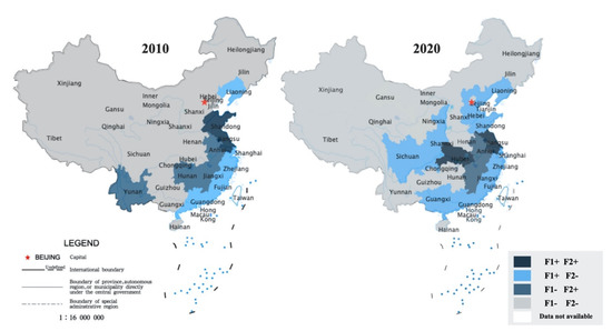 In turn, the following regions remained broadly the same over the decade, with the Jiangsu region remaining F1+ F2+ in 2010 and 2020. Liaoning, Shanghai, Zhejiang, Fujian, and Guangdong were F1+ F2− in both 2010 and 2020 while Anhui and Guangxi retained their F1− F2+ classification in both 2010 and 2020. Meanwhile, Beijing, Shanxi, Inner Mongolia, Jilin, Heilongjiang, Henan, Hainan, Guizhou, Tibet, Gansu, Qinghai, Ningxia, and Xinjiang registered as F1− F2− in both 2010 and 2020.
