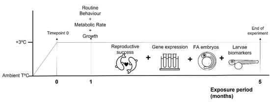 Another 80 fish were assigned as breeding pairs (male-female), at a density of two breeding pairs per 30 L tank and a total of 10 pairs per treatment. Pairs in each tank were separated by a partition to keep track of the identity of each parental pair. The partitions in the tank allowed constant renewal of the water and the maintenance of water temperature and quality on both sides. Size (3.68 ± 0.029 cm, mean ± s.e.) did not differ between fishes assigned to the different treatments (F(3:80) = 1.369, p = 0.258). Weight (0.633 ± 0.016 g, mean ± s.e.) was also not different at the start of the experiment for fish assigned to the treatments (F(3:80) = 0.716, p = 0.545). These pairs were exposed to treatment conditions for a 5-month period, which included the breeding season. Reproductive success was evaluated by measuring the number of clutches produced by breeding pairs, the average number of eggs, average egg area, and larval size at hatching and adult body condition. Additionally, the expression of reproduction related genes was measured in adults’ gonads, fatty acid content was measured in recently fertilized eggs and oxidative stress and energy metabolism-related biomarkers were measured in recently hatched larvae (Figure 1).