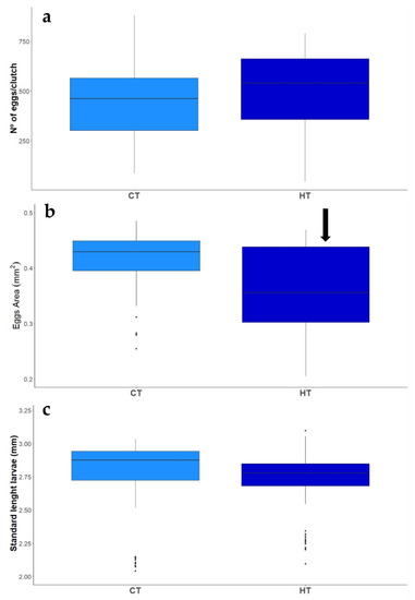 Effect of exposure to Control (CT) and High (HT) temperature treatments on the average number of eggs per clutch (a), egg area (b) and the size of larvae at hatch (c) of two-spotted goby, Pomatochistus flavescens. Black arrow indicates significant treatment effects (p ≤ 0.05), as compared to CT + HR treatment.