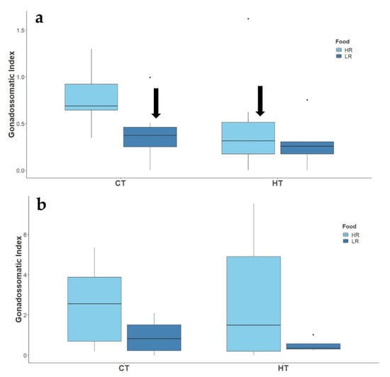 Effect of temperature (CT and HT) and food availability (HR, LR) on the gonadosomatic index of males (a), and females (b), of adult two-spotted goby, Pomatochistus flavescens. Black arrows indicate significant treatment effects (p ≤ 0.05) as compared to CT + HR treatment.