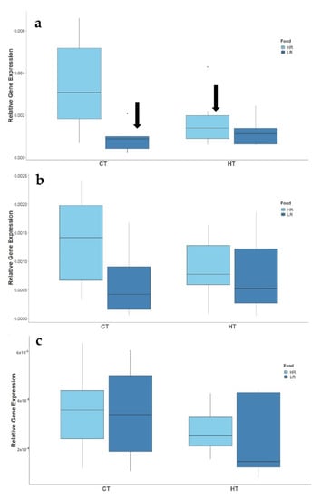 Effect of temperature (CT and HT) and food availability (HR, LR) on the expression of gonadal steroidogenic enzymes cyp11b1 (a); cyp19a1 (b); 20β-hsd (c) of two-spotted goby, Pomatochistus flavescens. Black arrows indicate significant treatment effects (p ≤ 0.05) as compared to CT + HR treatment.