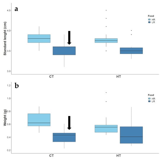 Effect of temperature (CT and HT) and food availability (HR, LR) on the standard length (a), and weight (b), of adult two-spotted goby, Pomatochistus flavescens, at the end of the exposure period. Black arrows indicate significant treatment effects (p ≤ 0.05) as compared to CT + HR treatment.