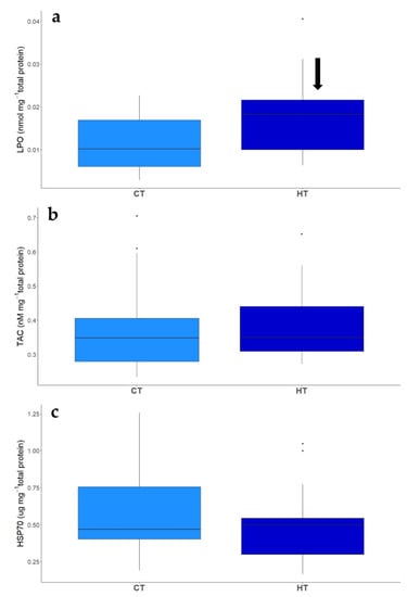 Biomarkers were selected based on their molecular roles in thermal and oxidative stress responses: (i) Hsp70 is a marker of reversible thermal damage to proteins (e.g., protein unfolding), acting as a chaperone [59,60,61], (ii) TAC measures the concentration of antioxidants in tissues, including both enzymatic (e.g., catalase, superoxide dismutase, glutathione peroxidase, etc.) and non-enzymatic antioxidants (e.g., vitamins and pigments) [62] and (iii) LPO is a marker of oxidative damage to cell membranes that arises from the interaction of reactive oxygen species with unsaturated fatty acids, producing lipid radicals and reactive aldehydes such as malondialdehyde [63].