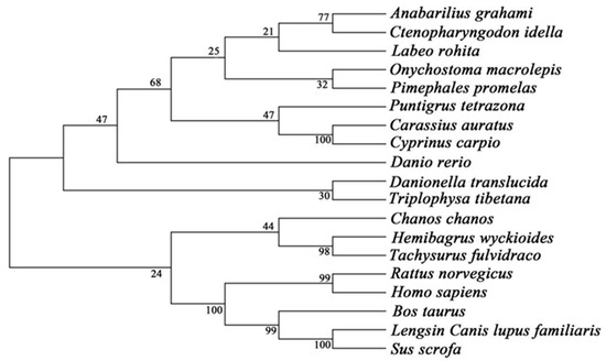 Phylogenetic analysis of GS gene. The tree is built on an alignment corresponding to full-length amino acid sequences using MEGA (4.0) and the Clustal W method. Branch numbers denote the bootstrap majority consensus values for 1000 replicates. The accession numbers are as follows: Triploid Carassius carassius, QXO15199.1; Cyprinus carpio, KTG44256.1; Anabarilius graham, ROJ13898.1; Puntigrus tetrazona, XP_043074757.1; Ctenopharyngodon idella, ALP73374.1; Onychostoma macrolepis, KAF4117067.1; Labeo rohita, RXN27864.1; Pimephales promelas, XP_039533199.1; Danionella translucida, TRZ00796.1; Hemibagrus wyckioides, KAG7320023.1; Chanos chanos, XP_030629061.1; Danio rerio, NP_853537.1; Triplophysa tibetana, KAA0719043.1; Tachysurus fulvidraco, XP_027016383.1.XP_043074757.1; Ctenopharyngodon idella, ALP73374.1; Onychostoma macrolepis, KAF4117067.1; Labeo rohita, RXN27864.1; Pimephales promelas, XP_039533199.1; Danionella translucida, TRZ00796.1; Hemibagrus wyckioides, KAG7320023.1; Chanos chanos, XP_030629061.1; Danio rerio, NP_853537.1; Triplophysa tibetana, KAA0719043.1; Tachysurus fulvidraco, XP_027016383.1.