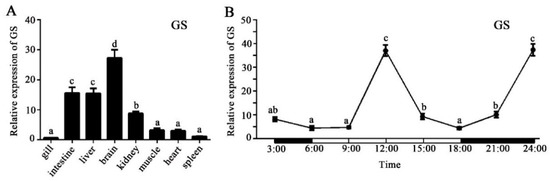 In this study, we cloned a GS cDNA sequence containing a 1115 bp ORF encoding a protein with 371 amino acids. Phylogenetic tree analysis showed that it had the highest similarity with that of Cyprinus carpio, indicating the evolutionary conservation of the GS gene in bony fish. The experimental results of the tissue expression analysis of the GS gene showed that it was widely distributed in various tissues and that the expression level was relatively high in the brain, intestine, and liver. The diversity of GS tissue expression may be related to the diversity of Gln function. In the brain, Gln is an important ammonia carrier and plays an important role in removing ammonia toxicity from the brain [28]. In the intestine, Gln plays an important role in maintaining and repairing the structural and functional integrity of the intestine and normal immune response [29]. In the liver, Gln promotes the production of glutathione and enhances the antioxidant capacity [30]. However, GS mRNA demonstrated its highest expression in the intestinal tract of grass carp, indicating the diversity of the GS gene expression map [12]. To further study the expression characteristics of the GS gene, we detected the circadian expression rhythm in muscle. The results showed that GS mRNA expression was significantly oscillated, and a similar conclusion was observed in the skeletal muscle of mice [31]. Additionally, the expression profile of the GS gene in the skeletal muscle of mice followed a pattern similar to that of endogenous corticosterone and shifted to the right for several hours. However, we found that the expression of the GS gene did not demonstrate an obvious correlation with diet. We fed the fish at 9:00 and 15:00, and GS gene expression was the highest at 12:00 and 24:00, respectively, indicating that the nutritional regulation of the GS gene in muscle requires further study.