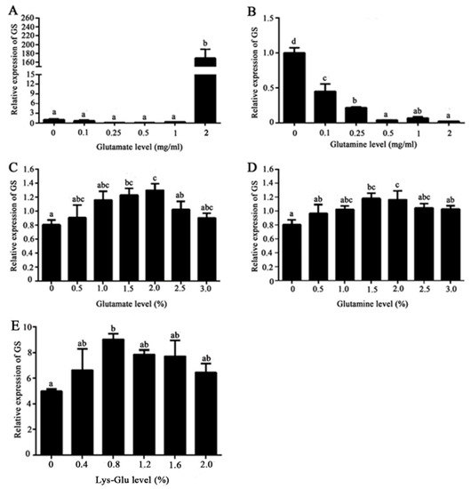 Effects of glutamate, glutamine, and Lys-Glu on GS mRNA expression in vitro and in vivo. (A,B) Effects of glutamate (A) and glutamine (B) on GS mRNA expression in vitro; (C–E) effects of glutamate (C), glutamine (D), and Lys-Glu (E) on GS mRNA expression in vivo. Error bars indicate the mean ± SD. Tukey’s multiple range test was performed and different letters represent significant differences (p < 0.05, n = 3 for each group).