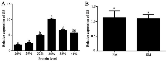 Moreover, the effects of dietary protein levels and dietary protein sources on GS expression were studied. In this study, we detected GS mRNA expression levels at different protein levels (26%, 29%, 32%, 35%, 38%, and 41%), and the results showed that there were differences in GS expression at different protein levels, with the highest expression level being found when the protein content was 35% (p < 0.05) (Figure 4A). In addition, we also explored the effects of the feed protein source on gene expression but found that the mixed plant feed protein source and fish meal group had no significant effects on GS expression (Figure 4B).