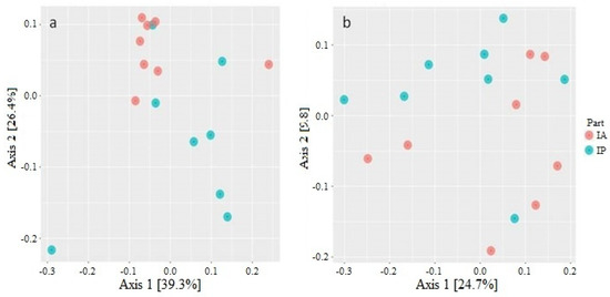 Principal coordinate analysis (PCoA) of the bacterial communities. (a) Calculated from the weighted UniFrac distance matrix and (b) calculated from the unweighted UniFrac distance matrix. Red circles represent samples from the intestinal anterior section and blue circles represent the intestinal posterior section of each individual of wild C. labrosus.