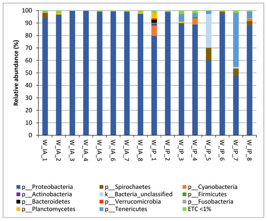 Relative abundance (percentage) at phylum level for each sample of intestinal microbiota from anterior and posterior sections of wild C. labrosus. In the figure, W_IA corresponds to the anterior intestinal section of wild fish, and W_IP corresponds to the posterior intestinal section of wild fish. ETC: phylum <1%.