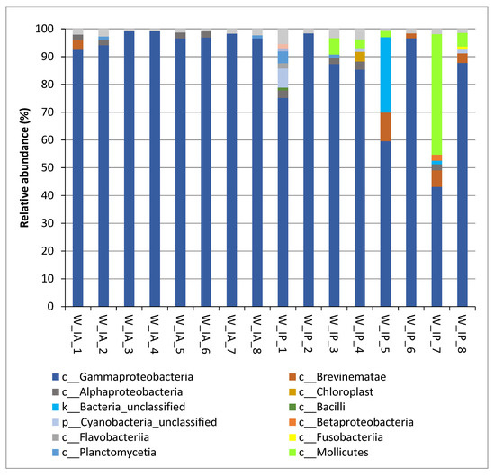 Relative abundance (percentage) at class level for each sample of intestinal microbiota from anterior and posterior sections of wild C. labrosus. In the figure, W_IA corresponds to the anterior intestinal section of wild fish, and W_IP corresponds to the posterior intestinal section of wild fish.
